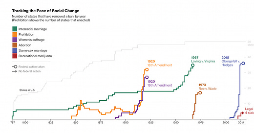 Most obviously, in issues such as same-sex marriage (characterised by the Obergefell vs Hodges case) or women’s right the vote (the 19th amendment), things moved slowly, or even sometimes in the wrong direction, for decades, before a sudden flurry of activity led to an increasing number of state-wide wins, culminating in a national level win.